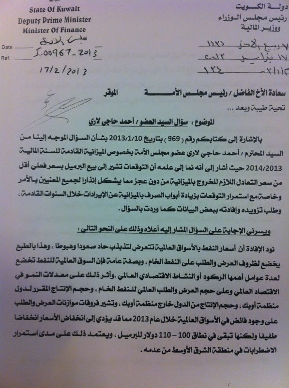 الشمالي ردا على سؤال لأحمد لاري: يصعب استمرار تقديم الخدمات بالمجان 21 فبراير 2013 مجلس الأمة, مقالات مميزة 0 رد وزير المالية مصطفى الشمالي على سؤال للنائب احمد لاري وتحدث الشمالي عن ضرورة فرض رسوم على الخدمات لانه لا يمكن الاستمرار في تقديمها بالمجان او برسوم رمزية. ونعرض فيما يلي صورا لكتاب رد الشمالي على النائب لاري: